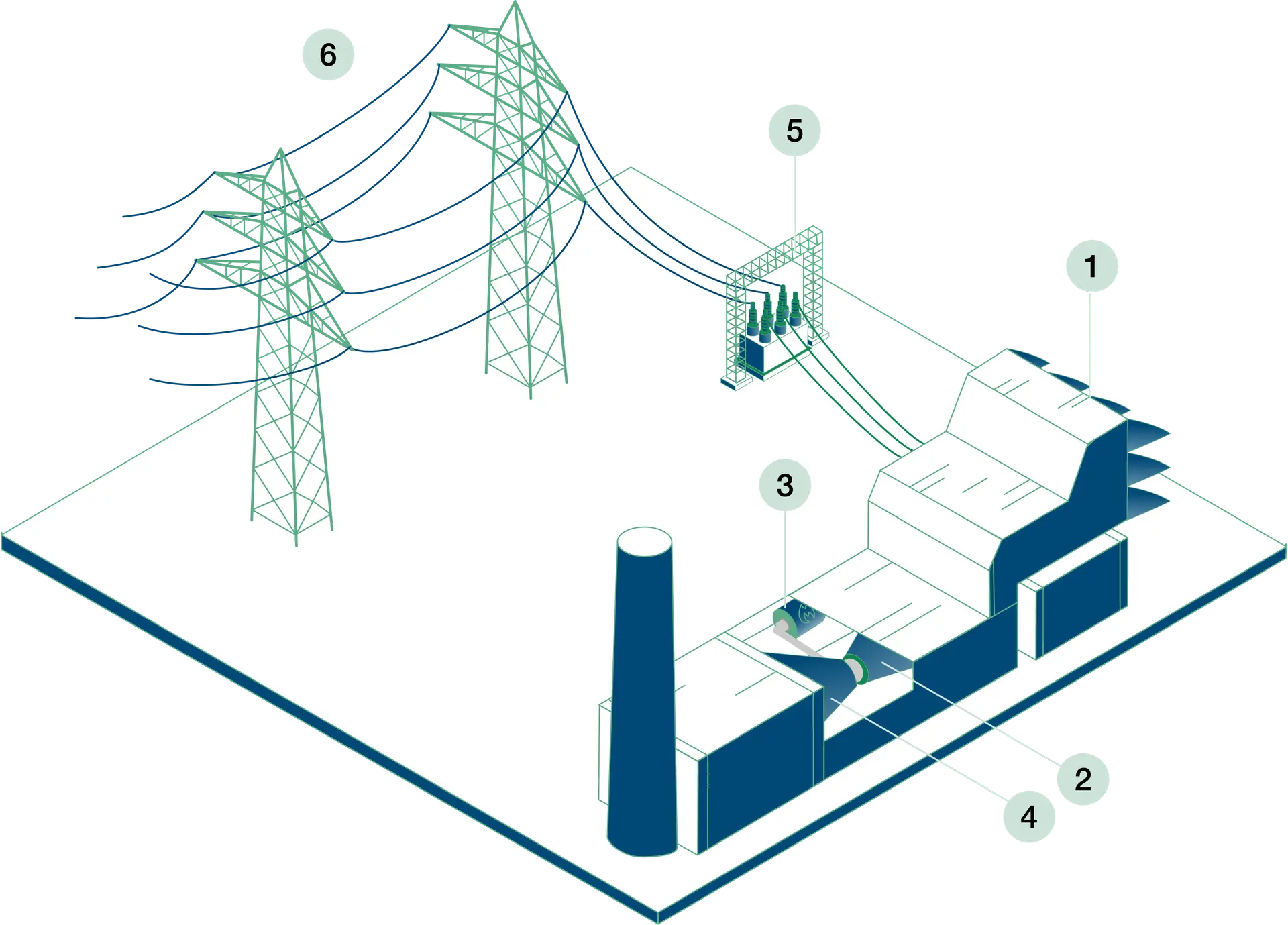 Electricity is transmitted via transmission lines to the power grid.